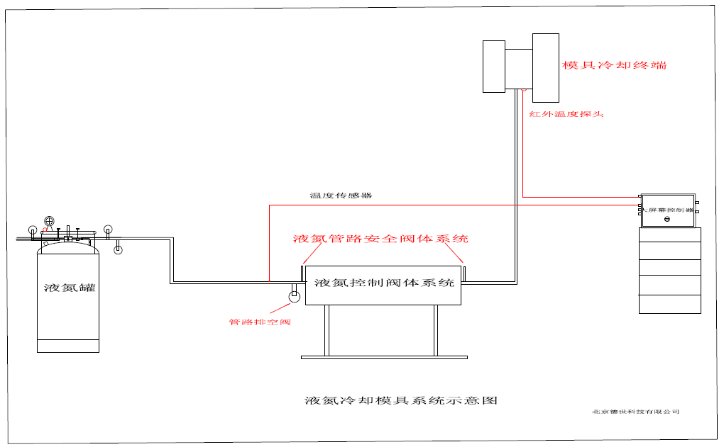 控制系統(tǒng)主要由液氮輸送管路、控制閥體、溫度監(jiān)控、自動旁通、安全系統(tǒng)等一整套系統(tǒng)整合的自動控制系統(tǒng)組成。液氮輸送管路負責(zé)從液氮罐體輸送液氮到控制系統(tǒng)閥體,再輸送到鋁模具端液氮套裝內(nèi)部。整體系統(tǒng)運行由控制系統(tǒng)來運作。